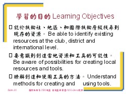 材料Materials: 投影片Slides 20. 學習的目的Learning Objectives 21. 社員發展資源Membership Development Resources 22. 你有什麼經驗…What experiences have you had…